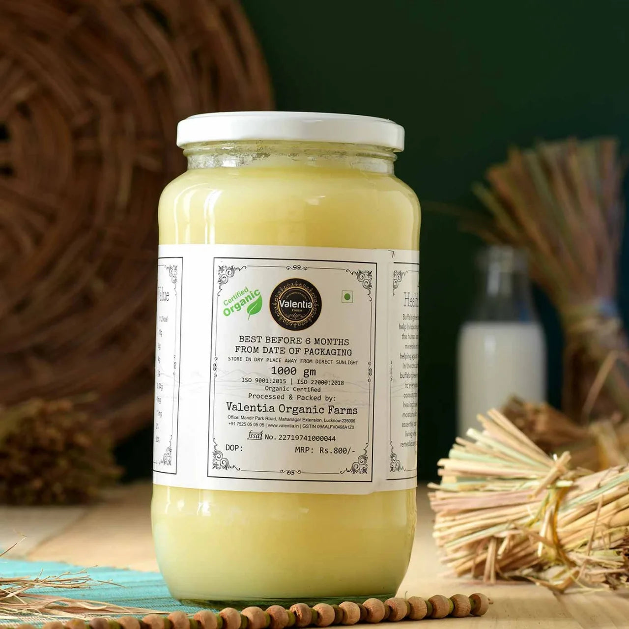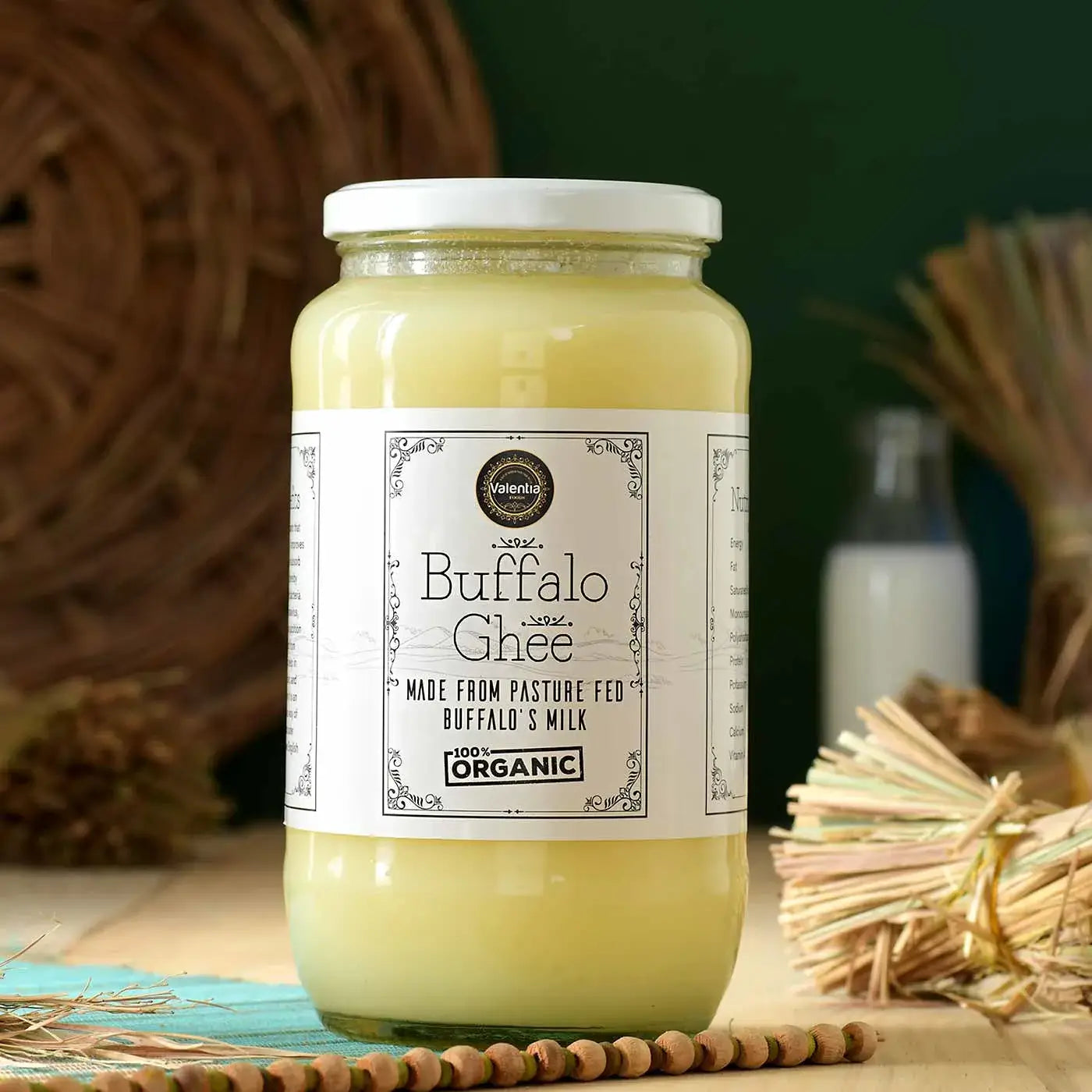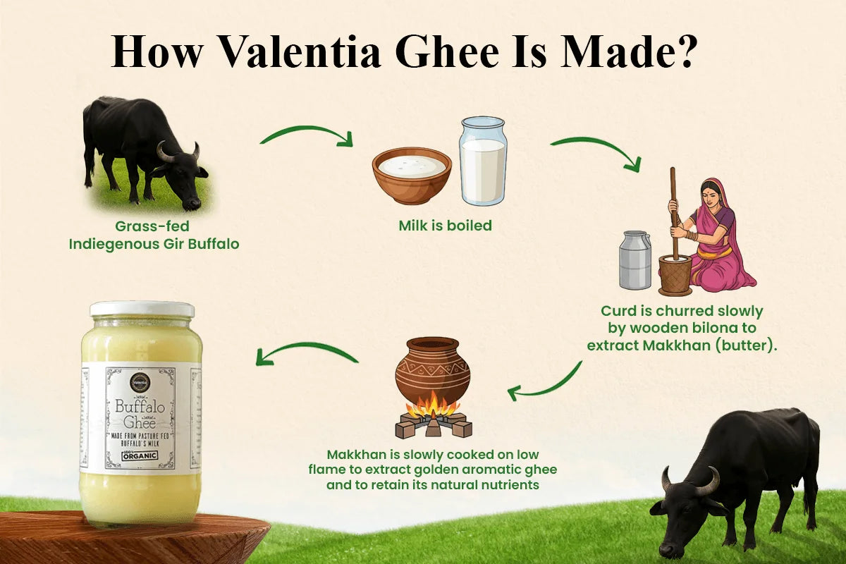 Valentia Organic Ghee is made from milk sourced from pasture-fed indigenous breeds (Murrah Buffalo, A2 Desi Cow, Gir Cow, and Sahiwal Cow). We use the traditional bilona method, where milk is curdled, hand-churned into butter, and then slowly simmered over a low flame to retain maximum nutrition, natural aroma, and authentic flavor.