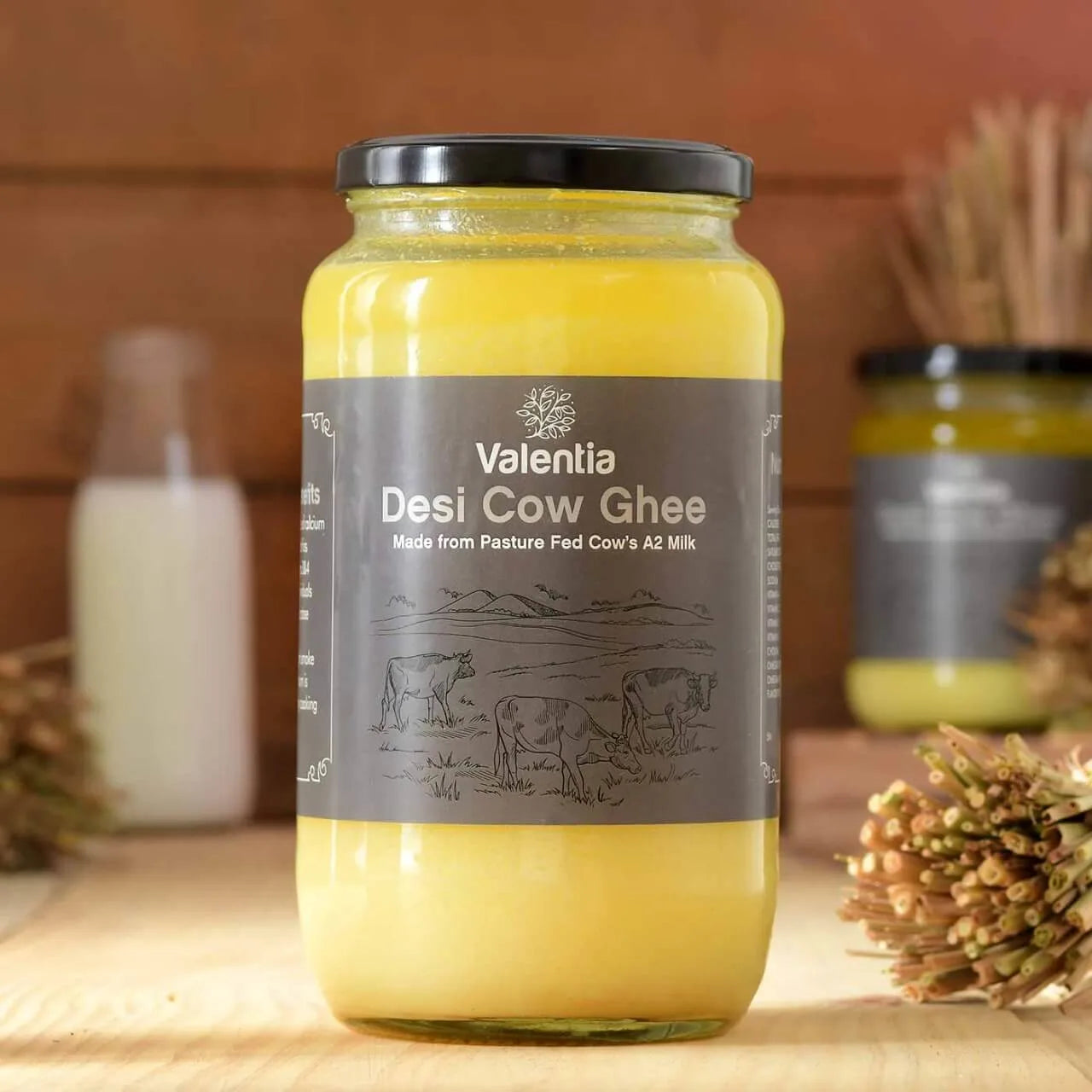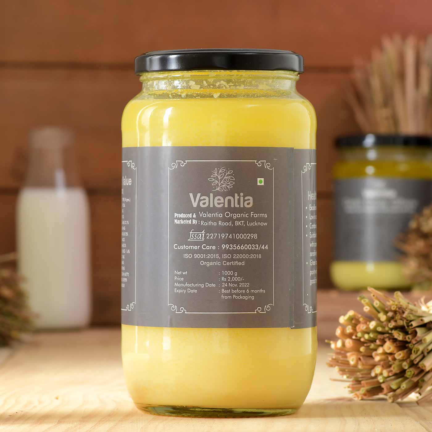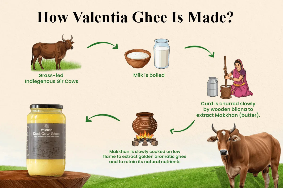 Valentia Organic Ghee is made from milk sourced from pasture-fed indigenous breeds (Murrah Buffalo, A2 Desi Cow, Gir Cow, and Sahiwal Cow). We use the traditional bilona method, where milk is curdled, hand-churned into butter, and then slowly simmered over a low flame to retain maximum nutrition, natural aroma, and authentic flavor.