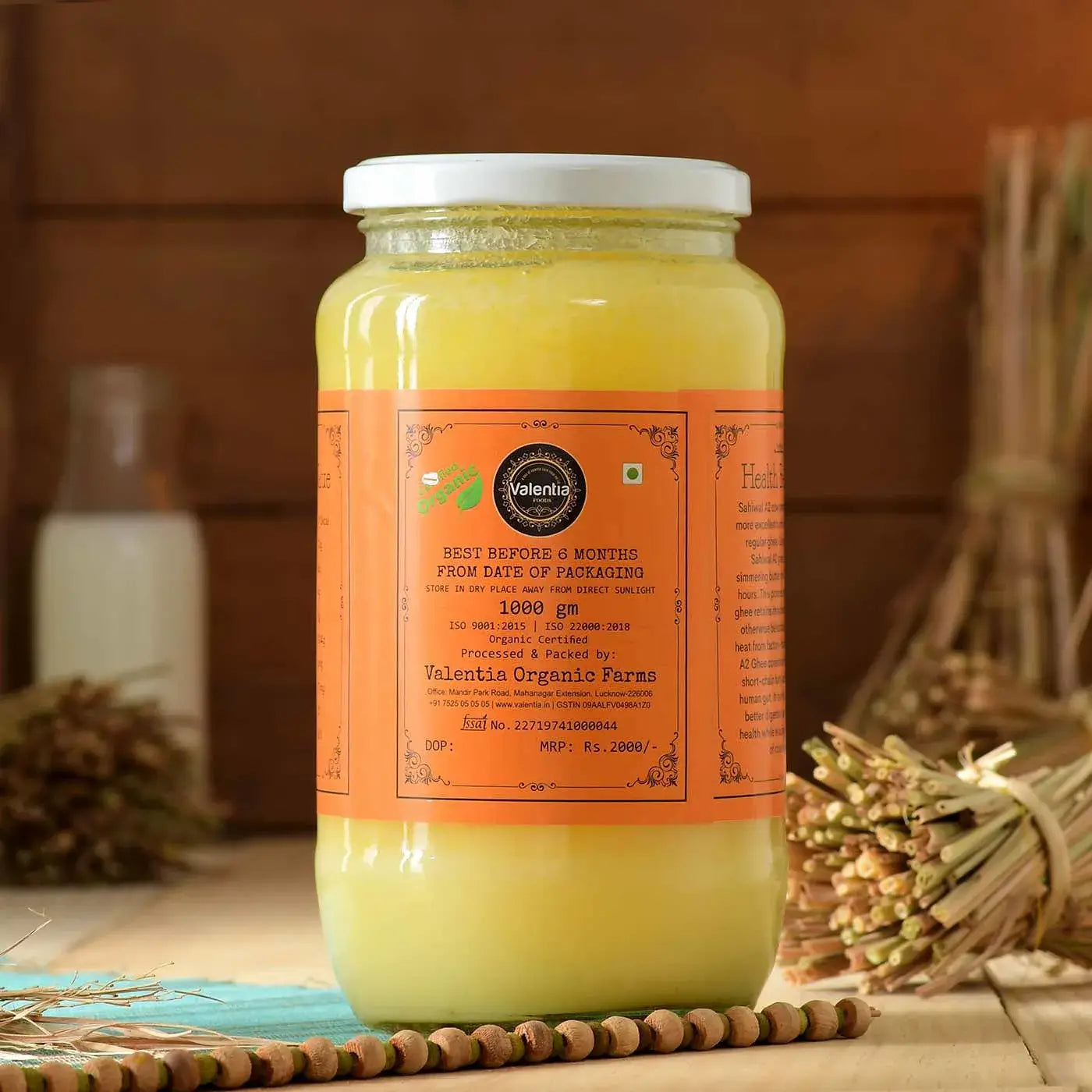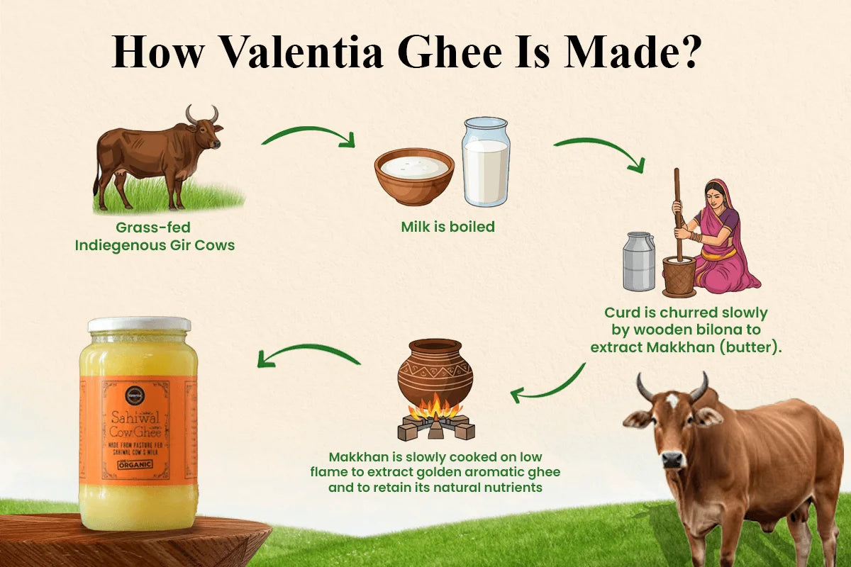 Valentia Organic Ghee is made from milk sourced from pasture-fed indigenous breeds (Murrah Buffalo, A2 Desi Cow, Gir Cow, and Sahiwal Cow). We use the traditional bilona method, where milk is curdled, hand-churned into butter, and then slowly simmered over a low flame to retain maximum nutrition, natural aroma, and authentic flavor.